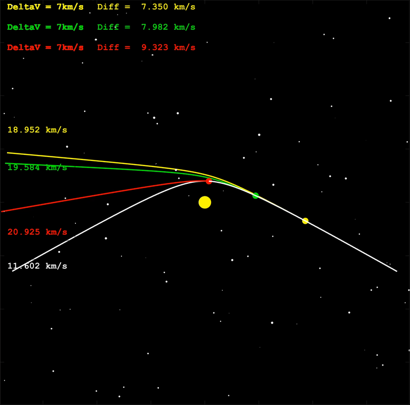 Khi ΔV được áp dụng gần Mặt Trời, động năng thu được cho mỗi đơn vị nhiên liệu sẽ lớn hơn nhiều nhờ hiệu ứng Oberth.