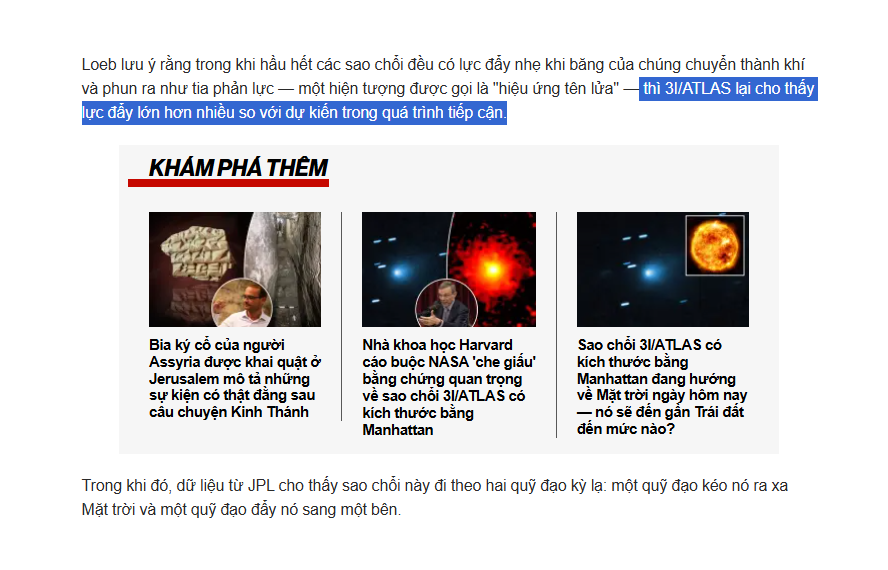 Đúng rồi — nhà vật lý thiên văn Avi Loeb (Đại học Harvard) từng bình luận về hiện tượng đặc biệt của 3I/ATLAS, một vật thể liên sao được phát hiện vào năm 2020, và ông cho rằng nó thể hiện lực đẩy phi hấp dẫn (non-gravitational acceleration) bất thường khi đi qua Hệ Mặt Trời.