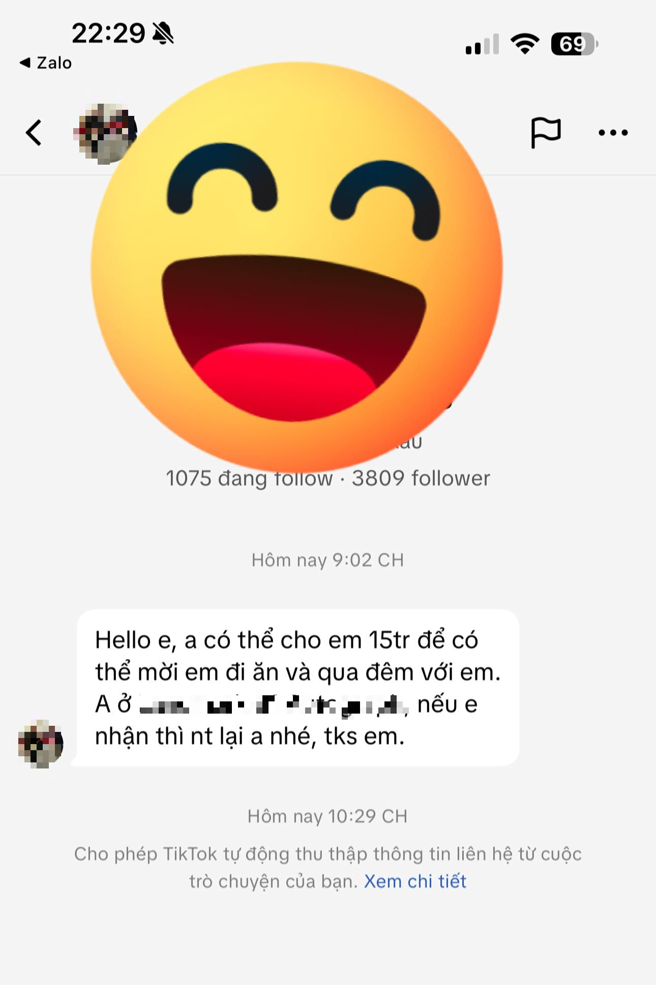 Theo đó, trong lúc kiểm tra tin nhắn, nữ DJ đã phát hiện một tài khoản lạ chủ động nhắn tin với nội dung vô cùng phản cảm. Người này thậm chí còn “báo giá” 15 triệu với lời đề nghị đầy khiếm nhã, ngỏ ý muốn “đi đêm” cùng cô. Dù quá quen với những lời đề nghị kiểu này, nữ DJ vẫn tỏ ra vô cùng khó chịu trước sự táo tợn của đối tượng. Tuy nhiên, thay vì im lặng bỏ qua hay bức xúc đôi co, cô nàng đã ngay lập tức chụp lại toàn bộ đoạn tin nhắn và chia sẻ công khai trên trang cá nhân.