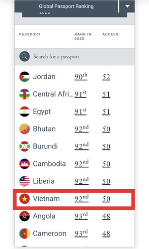 Bản cập nhật xếp hạng hộ chiếu của Henley Passport Index 2025 (HPI 2025) hôm 7/10 cho thấy hộ chiếu Việt Nam đứng thứ 92 toàn cầu, giảm 4 bậc so với lần xếp hạng trong tháng 9.