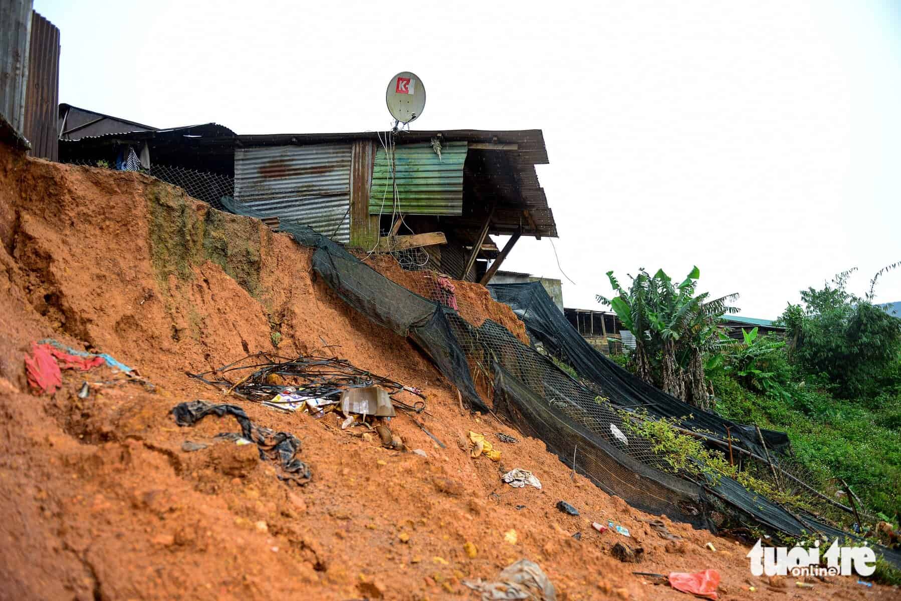 Cách đó vài căn, khu công trình phụ của gia đình chị K Long K Ri bị kéo sạt, bay cả phần móng, nghiêng đổ và nằm trơ trọi ở triền dốc. Theo chị K Ri, nhà của chị bị sạt lở từ đầu tháng 10-2025, kể từ khi đơn vị thi công xây dựng mương gom nước. Gần chục căn nhà khác cũng bị sạt lở áp sát phía sau, hở cả móng nhà và lộ kết cấu bên trong. Bên dưới bờ đất cao khoảng 5m là khu lòng chảo. Ở đây, chủ đầu tư đang san gạt mặt bằng, xây mương thoát nước. Bao quanh lòng chảo là nhà của hàng chục gia đình đã ổn định sinh sống 3 – 4 năm nay. Bà Să Riêng (53 tuổi) cho biết tình trạng sạt lở chỉ xuất hiện mạnh trong mùa mưa năm nay.
