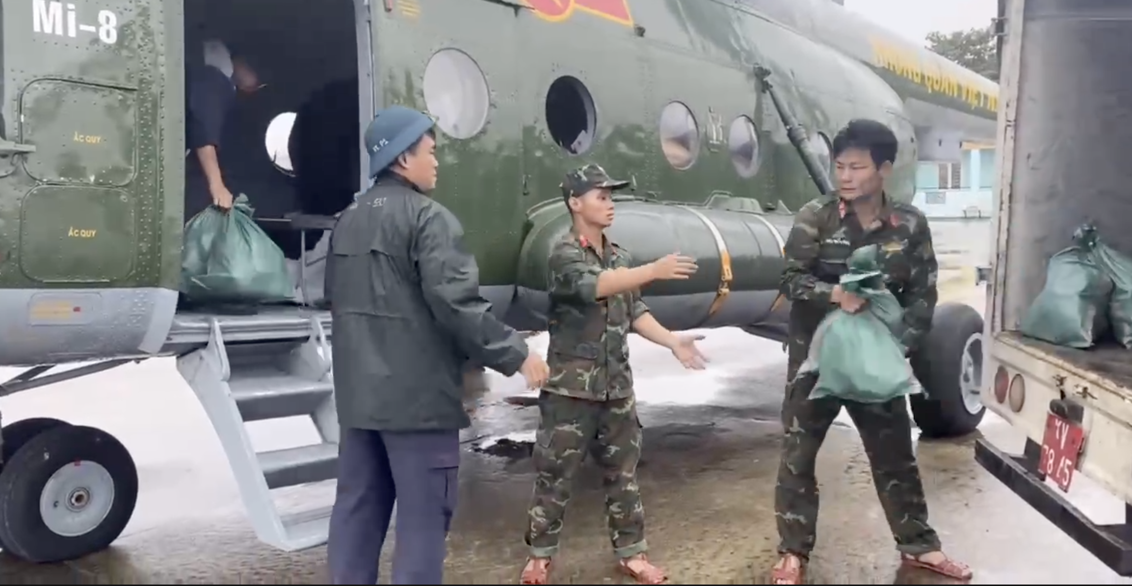 Bộ đội đưa hàng hóa lên trực thăng để tiếp tế vùng lũ - Ảnh: KHẢI ĐĂNG