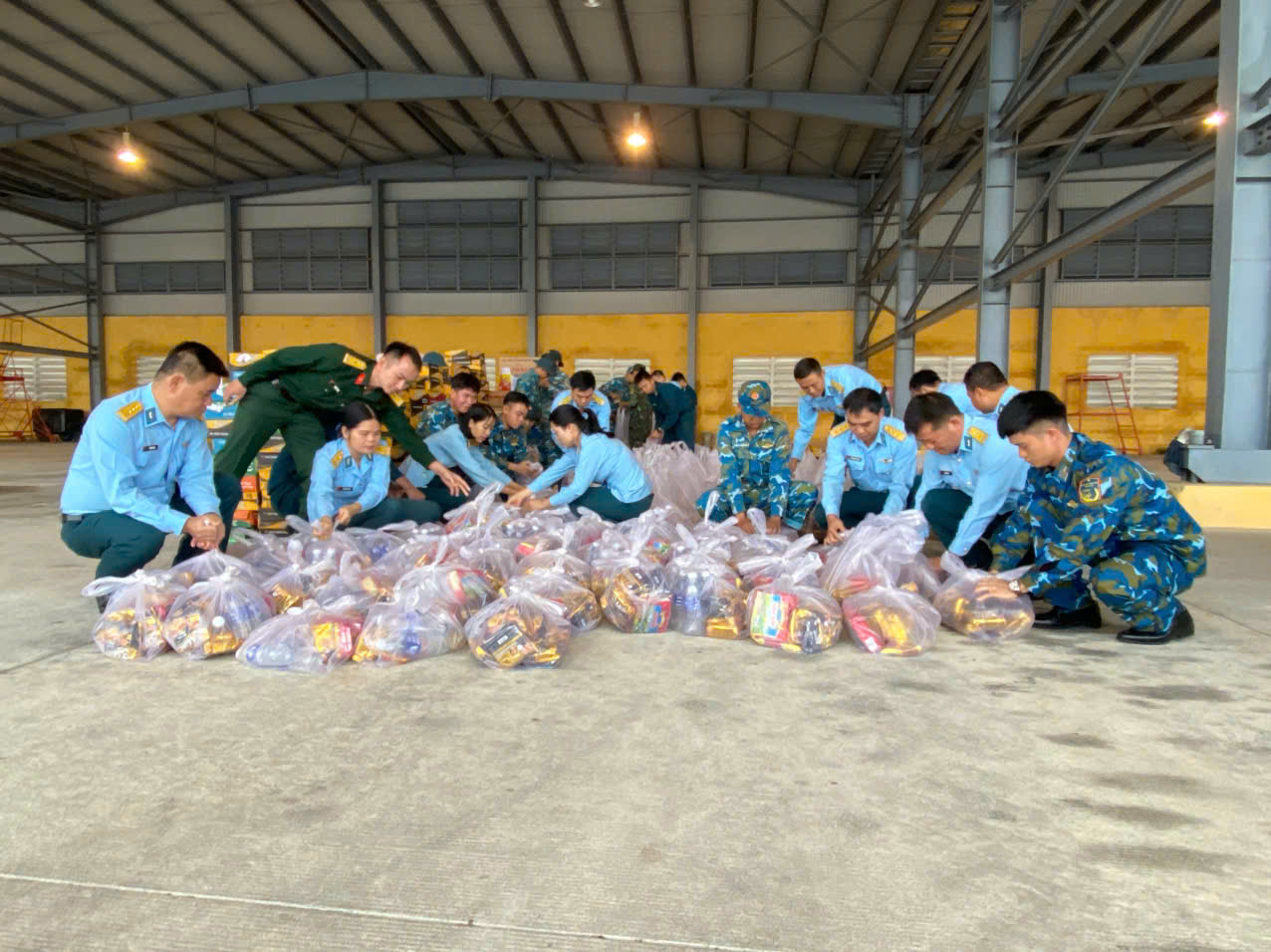 Sư đoàn 372 chuẩn bị hàng hóa sẵn sàng đưa lên trực thăng - Ảnh: KHẢI ĐĂNG