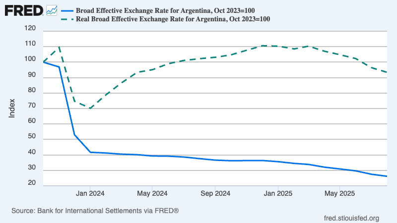 Vậy nên, Argentina dưới thời Milei đã đi theo cùng một kịch bản đen tối. Như biểu đồ dưới đây cho thấy, Milei bắt đầu bằng việc phá giá mạnh đồng peso — đường màu xanh lam — sau đó là tốc độ mất giá chậm hơn nhiều nhằm mục đích kéo lạm phát xuống. Nhưng lạm phát vẫn ở mức cao đến mức tỷ giá hối đoái thực tế của Argentina — đường màu xanh lá cây đứt nét — tăng nhanh chóng sau đợt giảm ban đầu, khiến Argentina ngày càng kém cạnh tranh: