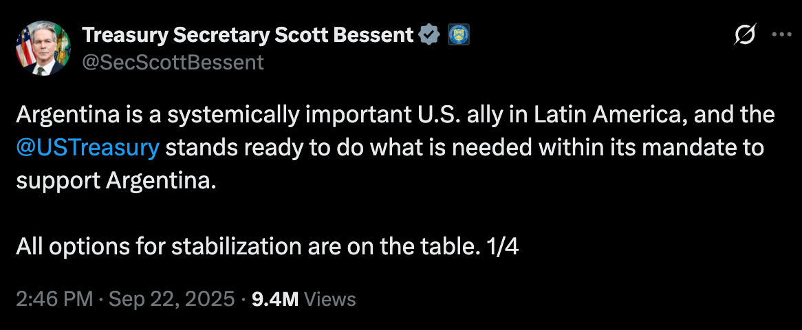 Vì vậy, có vẻ không bình thường khi Scott Bessent, Bộ trưởng Tài chính, đột nhiên tuyên bố vào thứ Hai rằng Hoa Kỳ sẵn sàng cung cấp hỗ trợ tài chính không giới hạn cho Argentina: