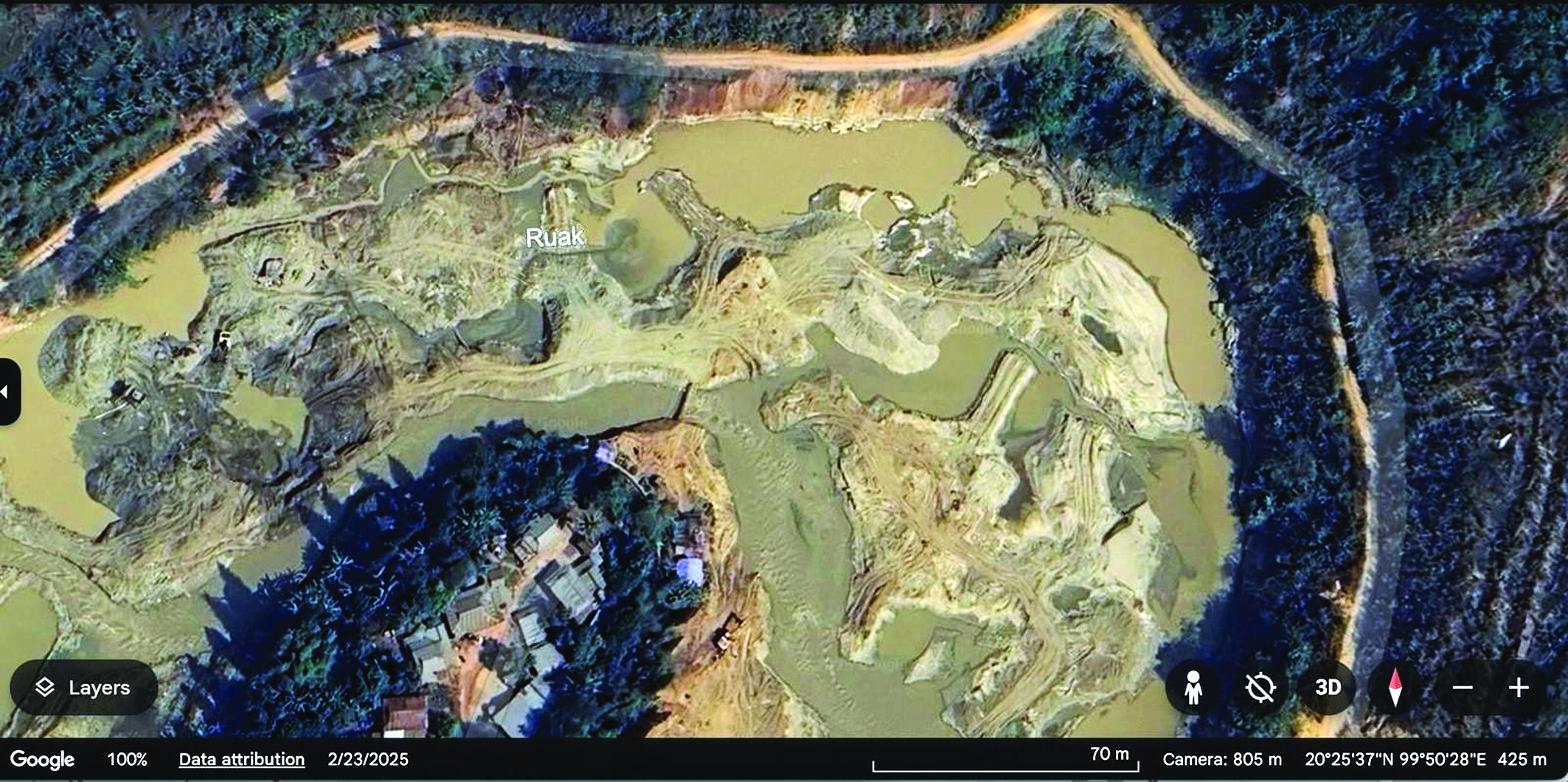 Một khu khai thác đất hiếm dọc sông Ruak ở bang Shan, Myanmar. Ảnh: GOOGLE EARTH / INTERNATIONAL RIVERS.
