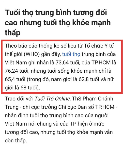 Ngoài ra, nguyên Bí thư Thành ủy TPHCM lập luận, hiện tuổi nghỉ hưu trung bình của Việt Nam là 59 đối với nam và 54 với nữ và đang trong lộ trình tăng dần lên 62 với nam (hoàn thành năm 2028) và 60 với nữ (hoàn thành năm 2035).