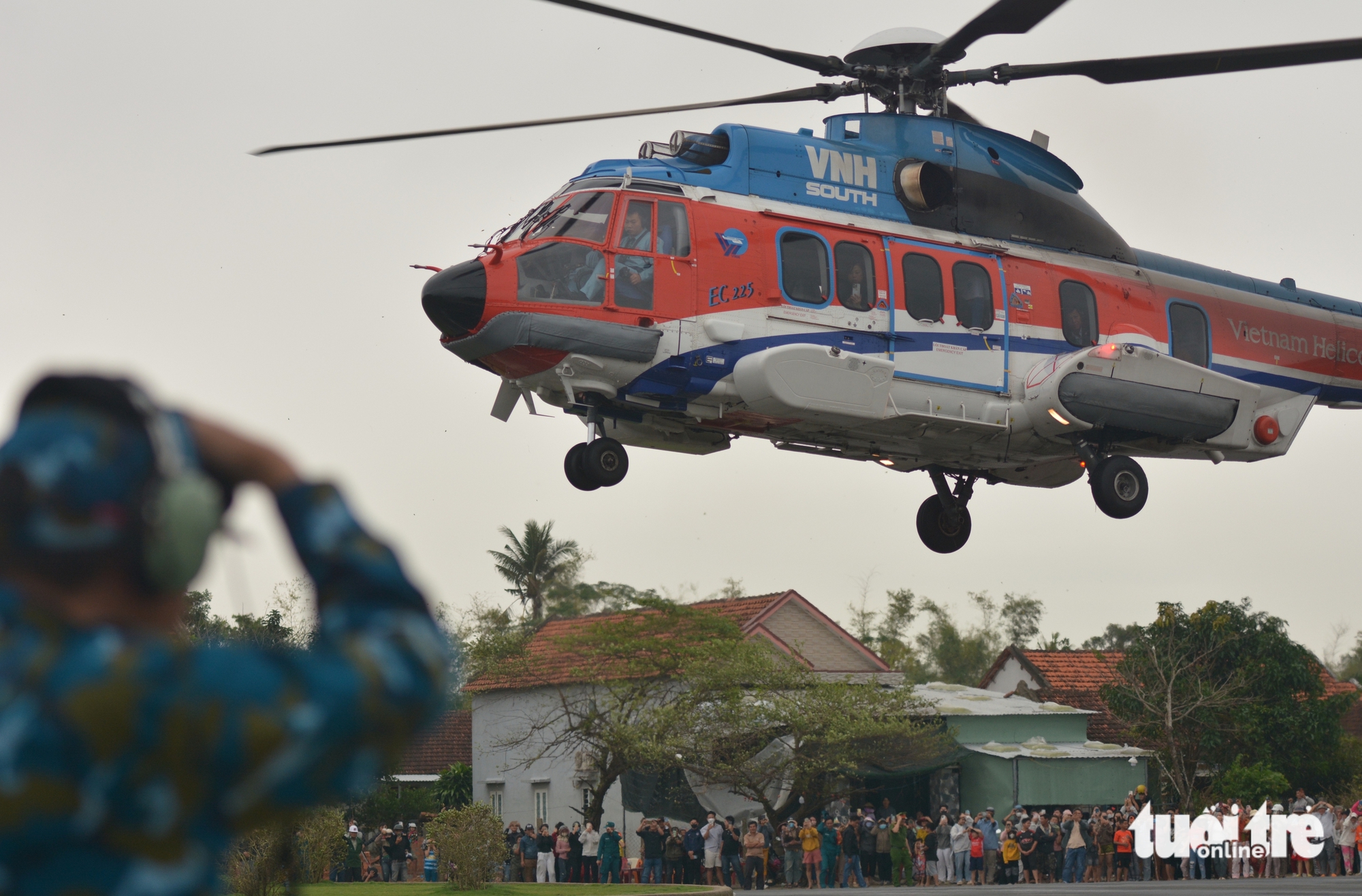 Trực thăng chở Thủ tướng Phạm Minh Chính cùng đoàn công tác đến thăm hỏi, động viên người dân vùng rốn lũ Phú Yên cũ (nay là tỉnh Đắk Lắk) chiều 29-11 - Ảnh: ĐỨC TRONG