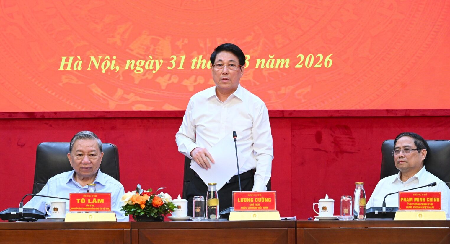 Ông Lương Cường (đứng), phải “về vườn” cùng một lượt với ông Phạm Minh Chính (bìa phải). (Hình: Chính Phủ).Tờ Tuổi Trẻ hôm 1 Tháng Tư đưa tin, bà Lê Thị Nga, phó chủ nhiệm thường trực Ủy Ban Dân Nguyện và Giám Sát, Quốc Hội, dành nhiều phút tại cuộc họp bàn về phát triển kinh tế chỉ để ca tụng ông Phạm Minh Chính “đã rất lăn lộn, bám sát thực tiễn.”