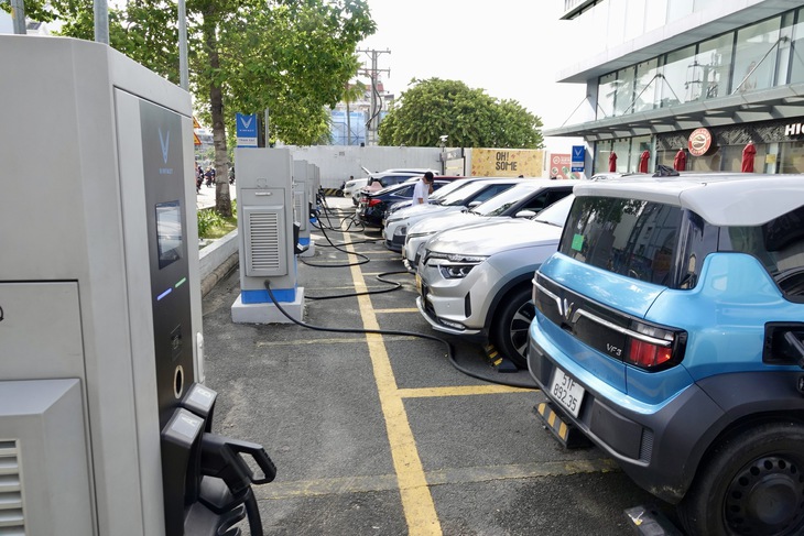 Nhiều khu trung tâm thương mại Vincom Plaza đầu tư trạm sạc điện cho ô tô, người dân đến sạc rất đông - Ảnh: T.T.D.