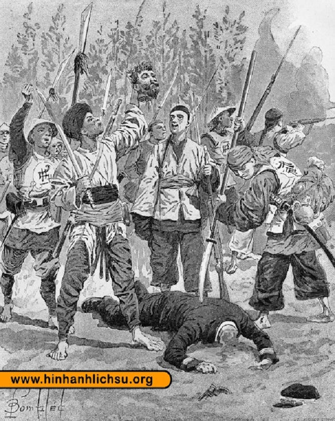 "Đến đây, các binh sĩ dũng cảm, và chúng ta sẽ đánh bại chúng!" Ông bắn hết 6 viên đạn từ súng lục của mình trong nỗ lực tự vệ, nhưng bọn cướp đã vây quanh ông, đâm ông bằng kiếm và giáo, chặt đầu ông, tàn nhẫn cắt xé xác ông, rồi bỏ chạy. Hai nhóm còn lại, nghe tiếng súng vội vã chạy tới, nhưng chỉ kịp thu hồi thi thể đầy máu của ông và mang nó về Hà Nội."