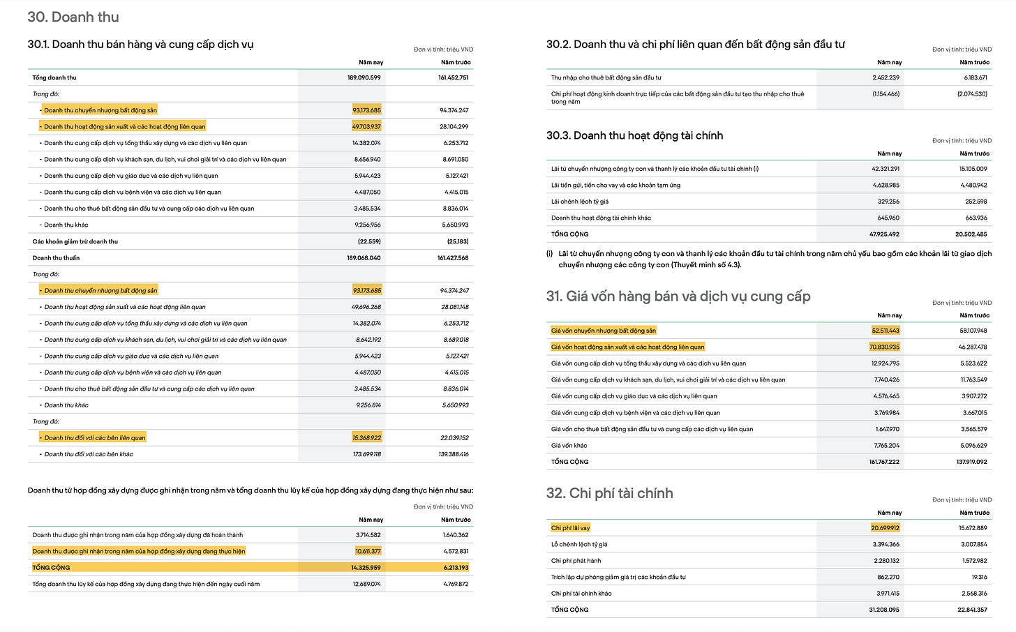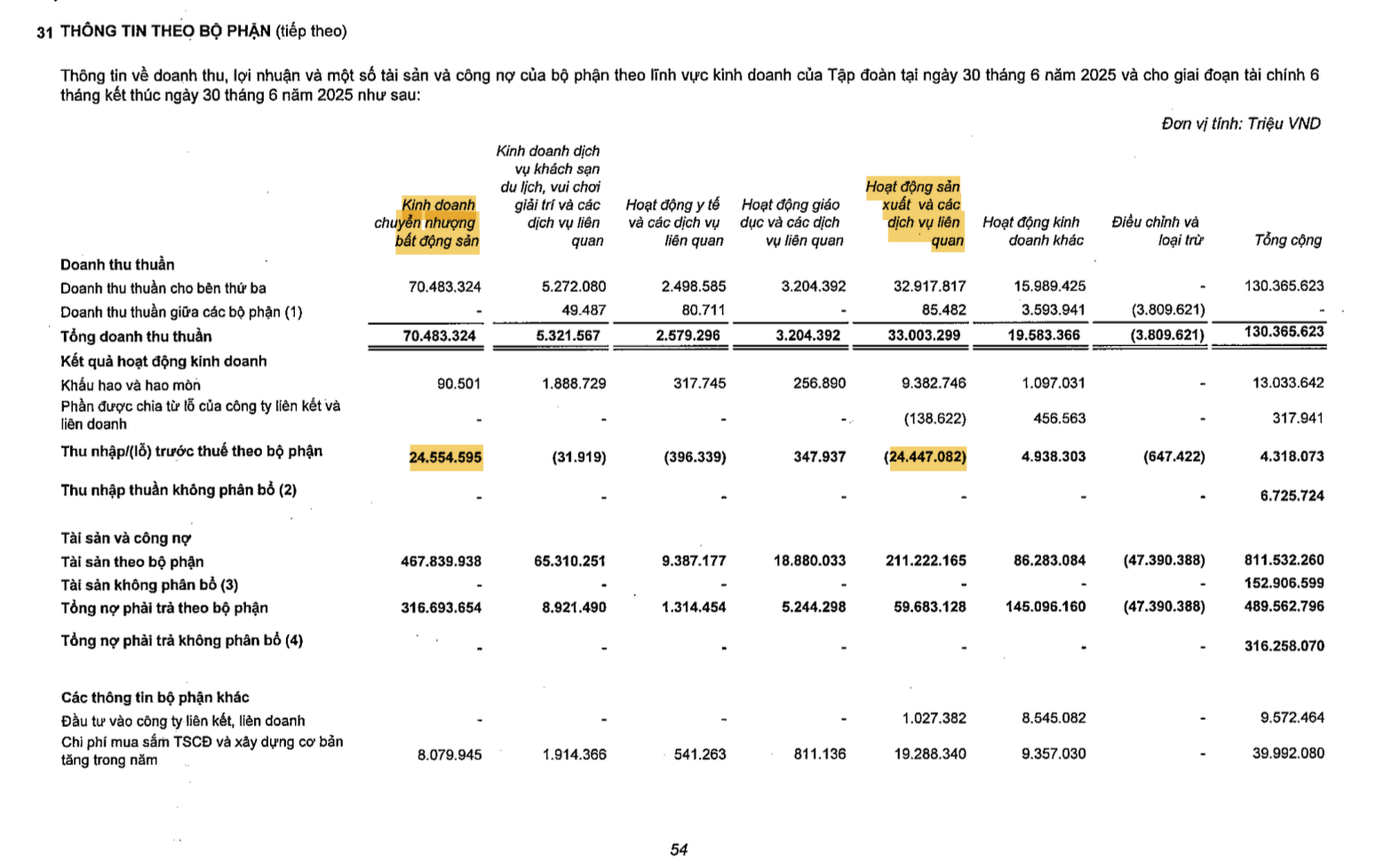 • Mảng "Kinh doanh bất động sản chuyển nhượng" có lợi nhuận trước thuế là dương 24.554 tỷ đồng.