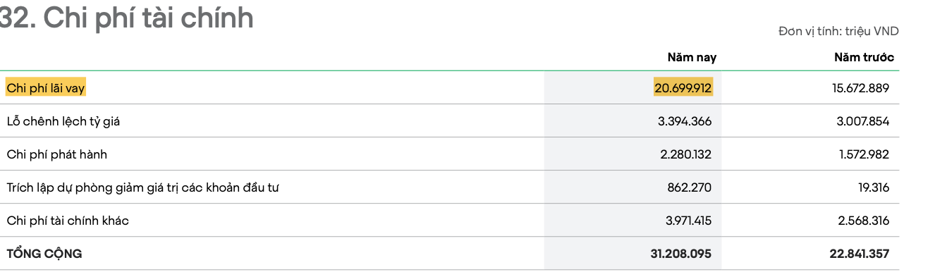• Và đây là cục tạ lớn nhất: 31.200 tỷ chi phí tài chính, trong đó riêng tiền trả lãi vay đã là gần 21.000 tỷ rồi.