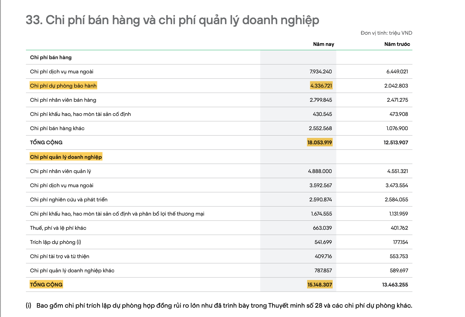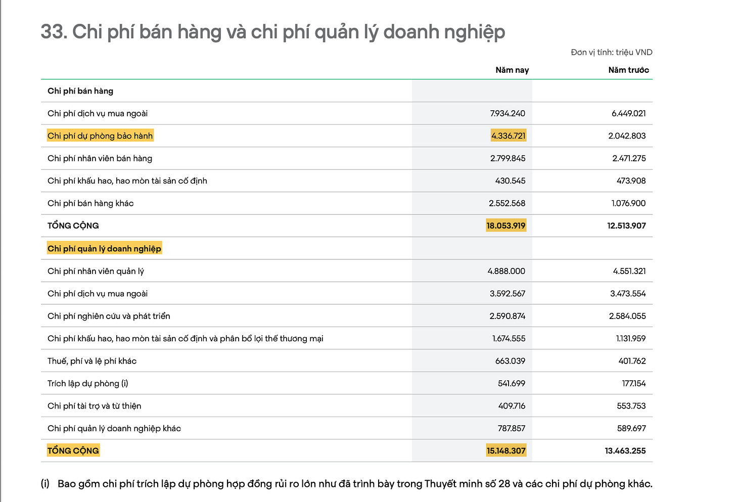 • 18.000 tỷ chi phí bán hàng và marketing (trong đó có 4.300 tỷ là tiền dự phòng để bảo hành xe).